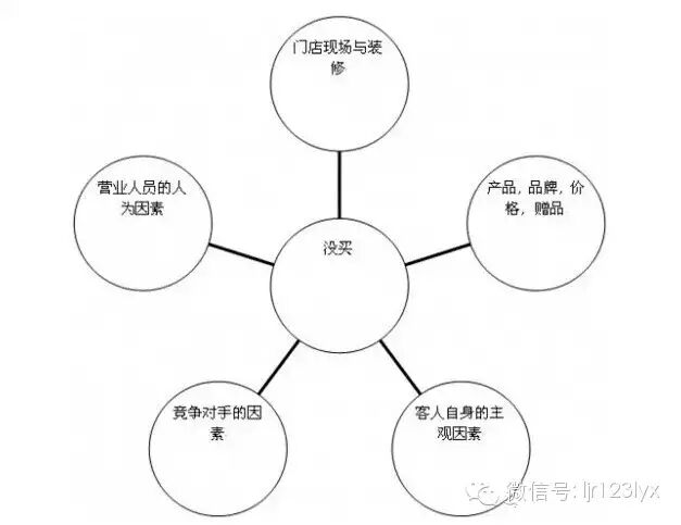 为什么会这样?按说,这顾客既然已经进店了,只要不是来专程砸场子的,或是竞争对手派来做调研的,或是眼神不好进错店的,在正常的范畴内,都是正常的顾客,既然能进店,就说明本身是存在一定的购买意愿的,或者说,也是给了店里一个机会,那么,后来究竟发生了什么事情,导致顾客放弃购买计划的?一般来说,顾客以后却没买,基本上有五大类原因:(如图)